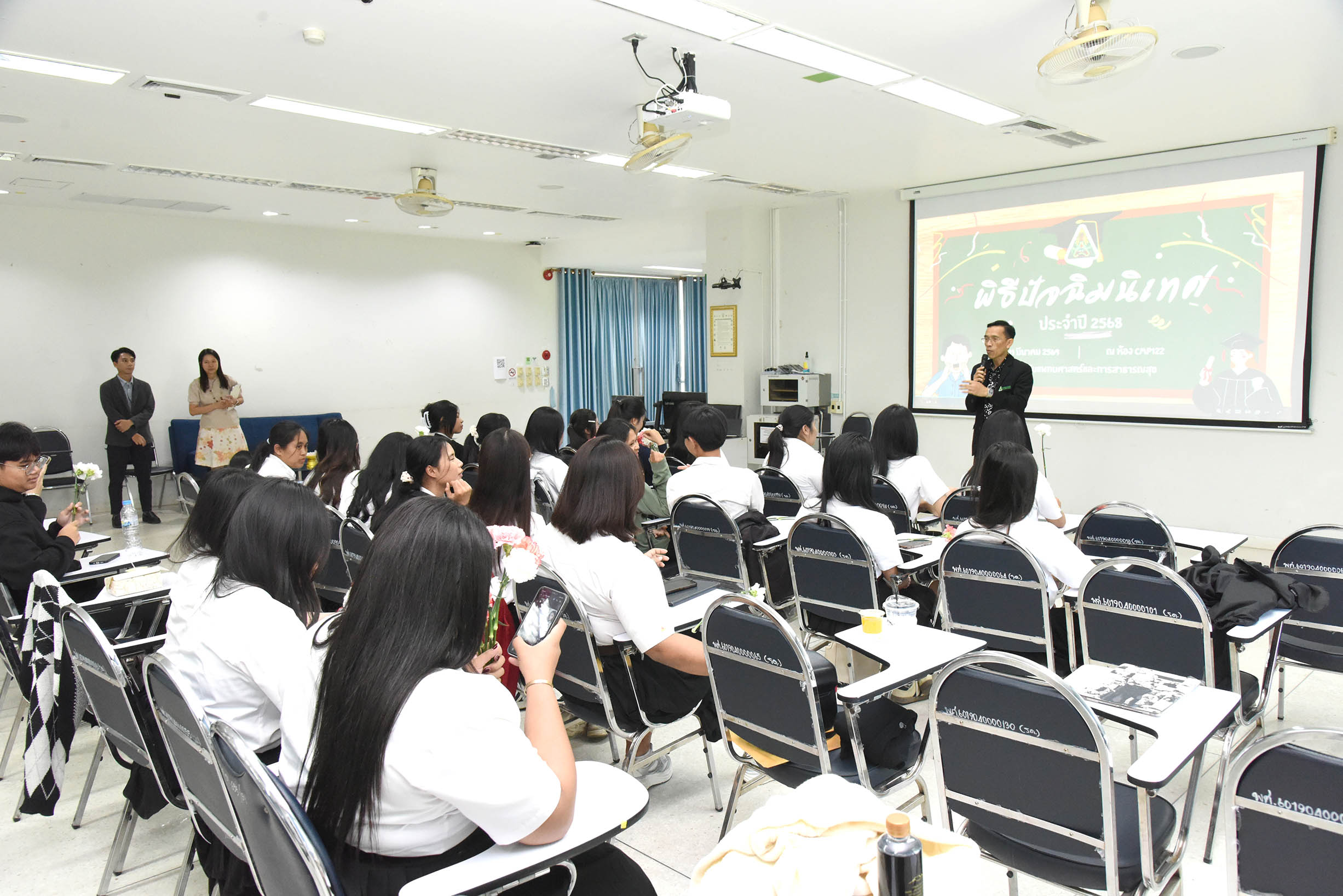 | ภาพกิจกรรมโครงการปัจฉิมนิเทศนักศึกษาหลักสูตรวิทยาศาสตรบัณฑิต (สาขาอนามัยสิ่งเเวดล้อม) ประจำปีการศึกษา 2568 ได้รับเกรียติจาก ศ.นพ.สงวนสิน รัตนเลิศ คณบดีวิทยาลัยแพทยศาสตร์และการสาธารณสุข เป็นประธานเปิดงานในครั้งนี้ โดยมี อาจารย์ชวพจน์ ศุภสาร อาจารย์ประจำสาขาการตลาด คณะบริหารศาสตร์ มหาวิทยาลัยอุบลราชธานี เป็นวิทยากร ถ่ายทอดประสบการณ์การทำงานให้กับนักศึกษาหลักสูตรวิทยาศาสตรบัณฑิต (สาขาอนามัยสิ่งเเวดล้อม) ชั้นปีที่ 4 วันพุธที่ 11 มีนาคม พ.ศ. 2569 ณ ห้องประชุม cmp 122 วิทยาลัยแพทยศาสตร์และการสาธารณสุข มหาวิทยาลัยอุบลราชธานี สามารถดาวน์โหลดภาพทั้งหมดได้ที่ https://drive.google.com/drive/folders/1yjZ1G-6FKOyGkS0tvFS8-04b2fZ56CcN?usp=sharing |