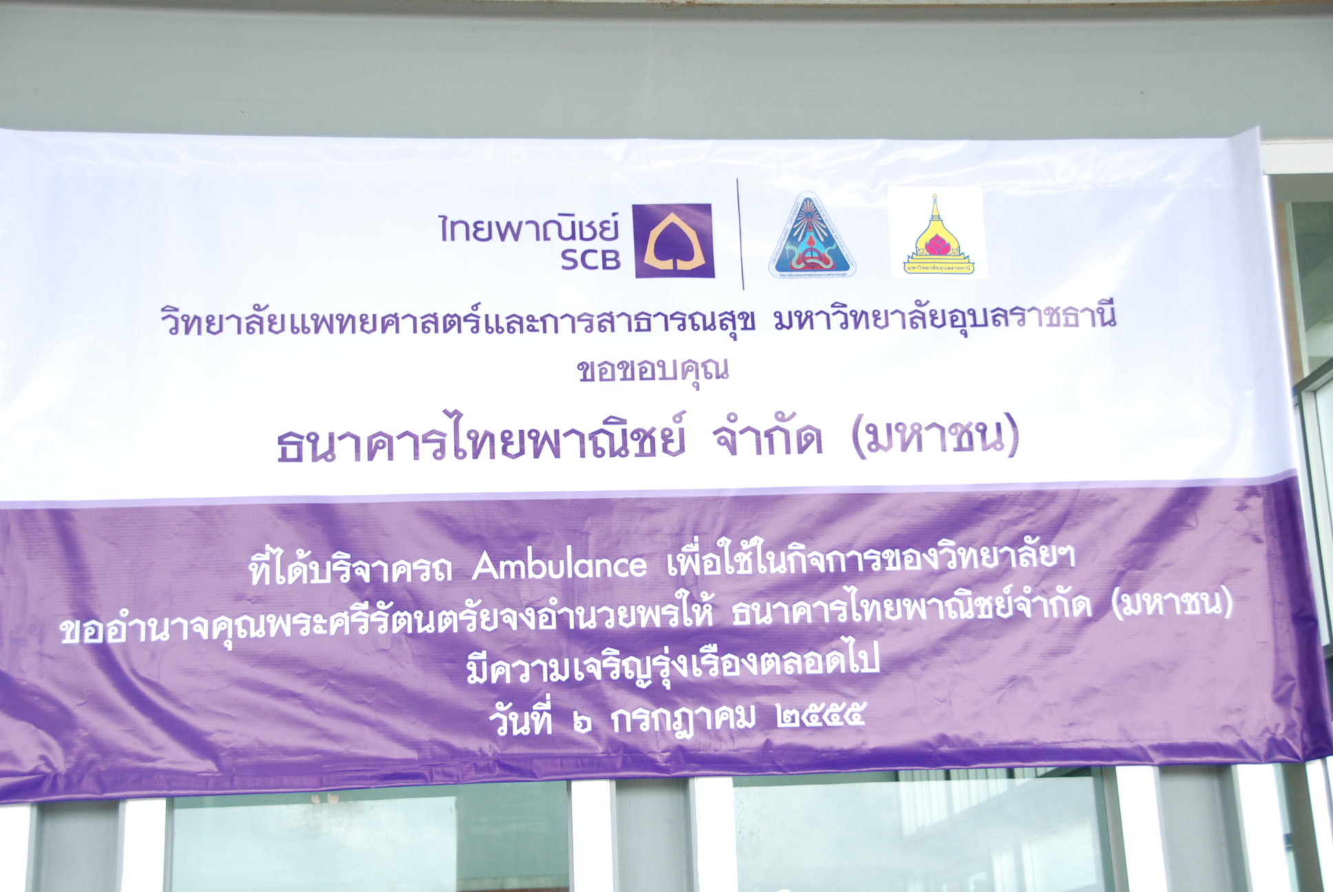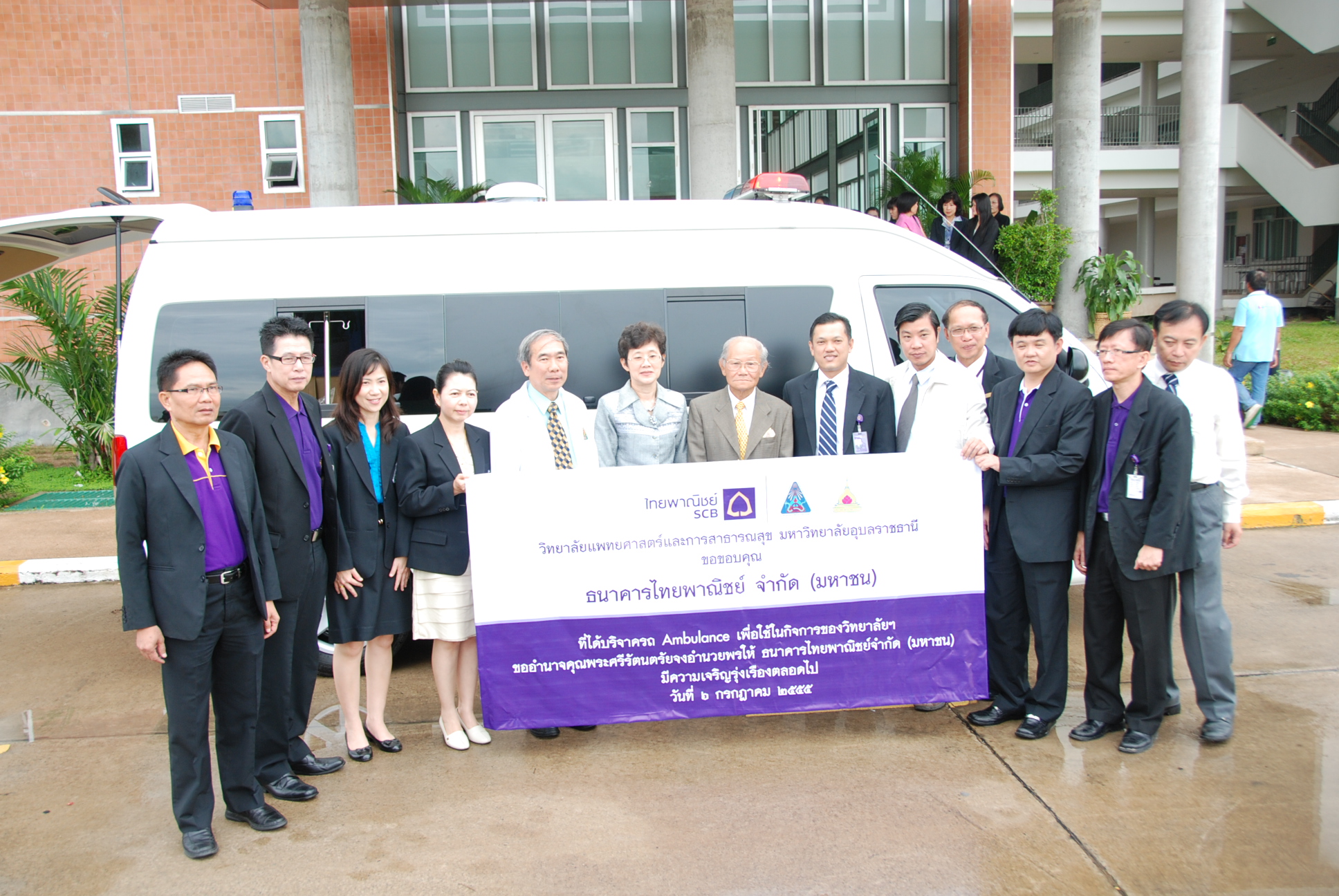 | วิทยาลัยแพทยศาสตร์และการสาธารณสุข ได้รับความอนุเคราะห์จากธนาคารไทยพาณิชย์บริจาครถ Ambulance พร้อมอุปกรณ์ภายในให้กับวิทยาลัยแพทยศาสตร์และการสาธารณสุข มหาวิทยาลัยอุบลราชธานี เพื่อรับ ส่งผู้ป่วย ในวันศุกร์ ที่ 6 กรกฎาคม 2555 เวลา 08.45 น. ณ วิทยาลัยแพทยศาสตร์และการสาธารณสุข มหาวิทยาลัยอุบลราชธานี |