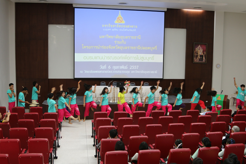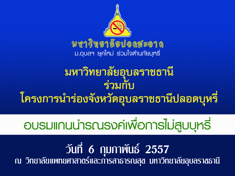 | มหาวิทยาลัยอุบลราชธานีร่วมกับโครงการนำร่องจังหวัดอุบลราชธานีปลอดบุหรี่ อบรมแกนนำรณรงค์เพื่อการไม่สูบบุหรี่ โดยได้รับเกียรติจาก นพ.วัฒนา พรรณพานิช รองคณบดีฝ่ายแผนและงบประมาณ วิทยาลัยแพทยศาสตร์และการสาธารณสุข เป็นประธานเปิดโครงการดังกล่าว |