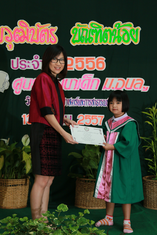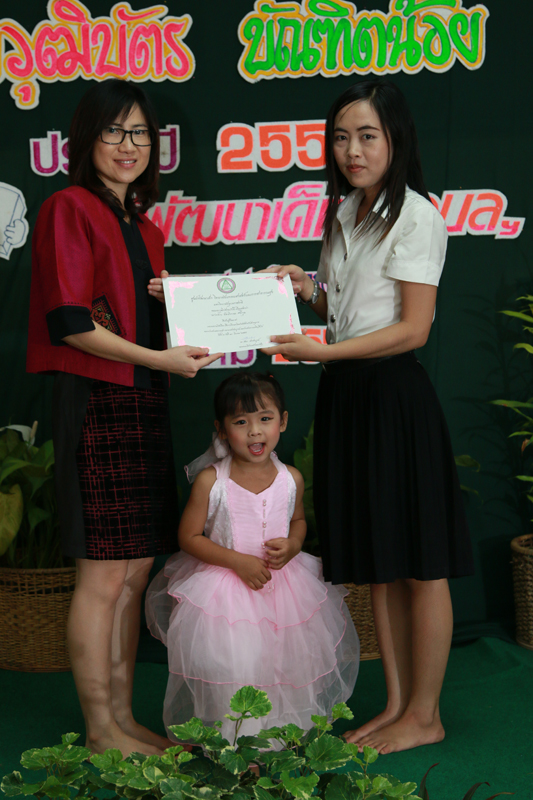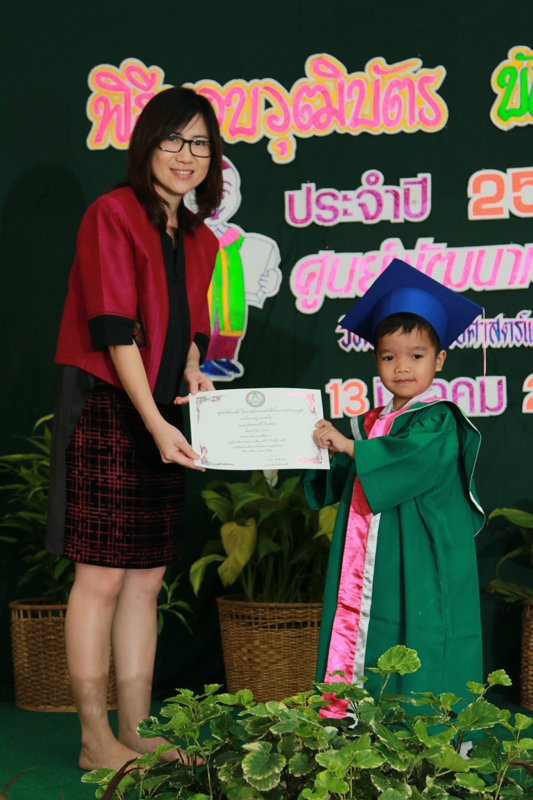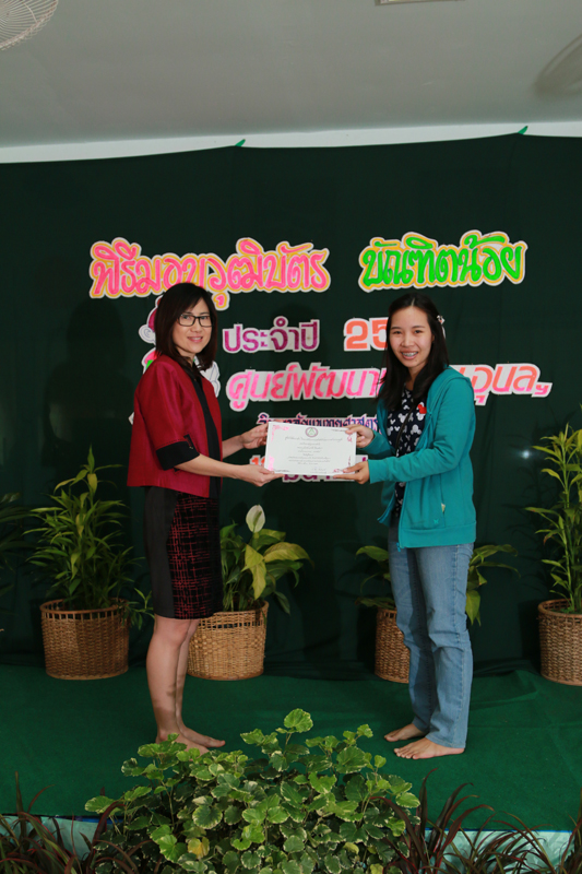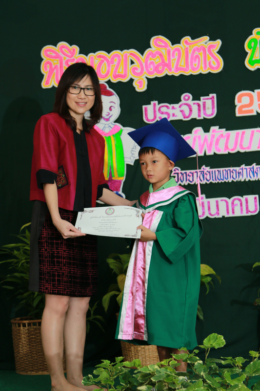 | ศูนย์พัฒนาเด็ก ได้รับเกียรติจาก ดร.รัตนา เล็กสมบูรณ์ รองคณบดีฝ่ายการคลังและพัสดุ วิทยาลัยแพทยศาสตร์และการสาธารณสุข มาเป็นประธานมอบวุฒิบัตรแก่นักเรียนที่จบการศึกษาชั้นอนุบาล และมอบวุฒิบัตรแก่นักศึกษาที่มีจิตอาสาช่วยเหลืองานศุนย์พัฒนาเด็ก |