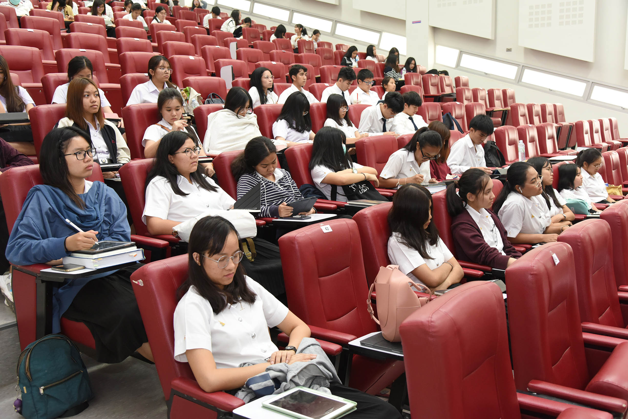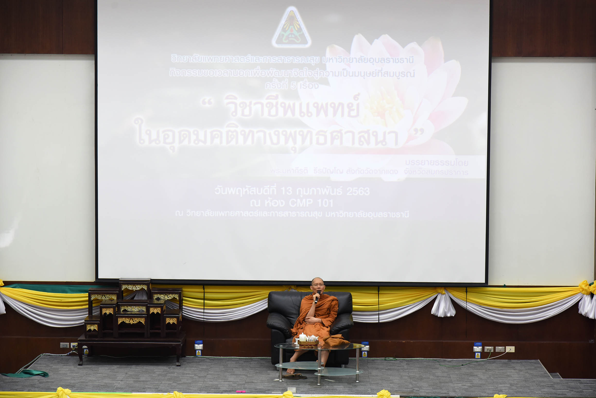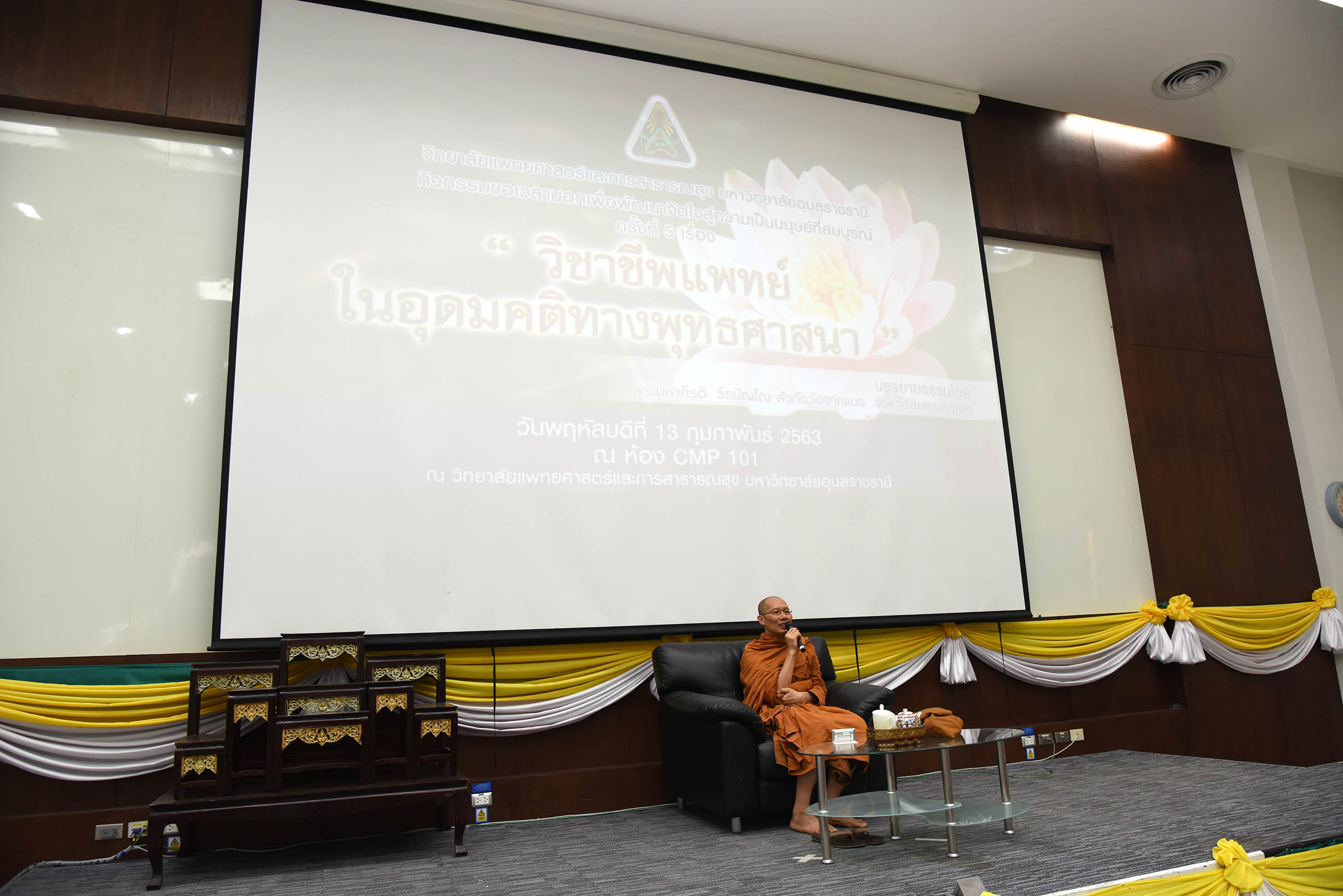 | ภาพกิจกรรมขอเวลานอกเพื่อพัฒนาจิตใจสู่ความเป็นมนุษย์ที่สมบูรณ์ ครั้งที่ 5 เรื่อง วิชาชีพแพทย์ในอุดมคติพุทธศาสนา บรรยายโดย พระมหากีรติ ธีรปัญโญ วัดจากแดง จังหวัดสมุทรปราการ ณ ห้อง CMP 101 วิทยาลัยแพทยศาสตร์และการสาธารณสุข มหาวิทยาลัยอุบลราชธานี (สามารถดาวน์โหลดภาพทั้งหมดได้ที่คลังภาพ goo.gl/gIFJBd ) |