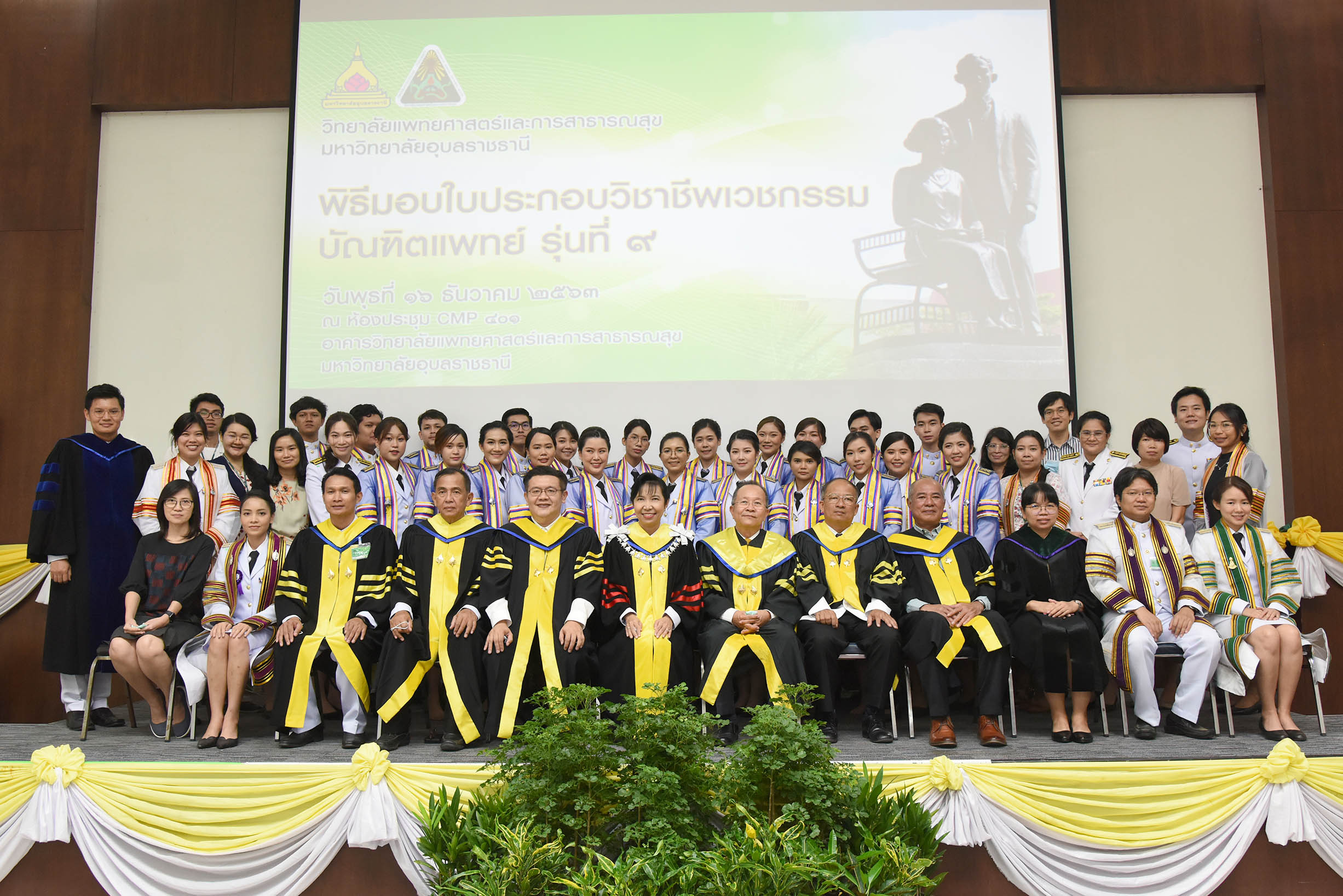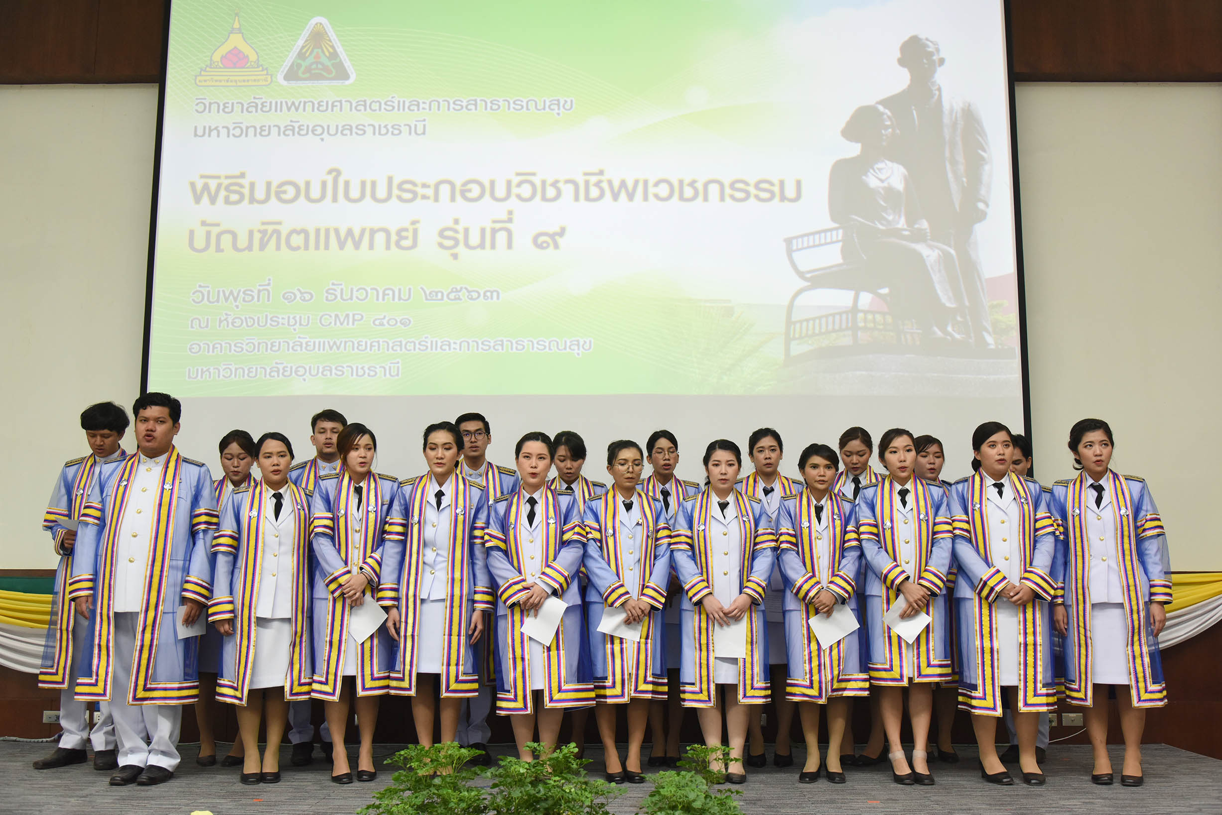 | พิธีมอบใบประกอบวิชาชีพเวชกรรม บัณฑิตแพทย์ รุ่นที่ 9 ประจำปีการศึกษา 2562 วันที่ 16 ธันวาคม 2563 ณ วิทยาลัยแพทยศาสตร์และการสาธารณสุข มหาวิทยาลัยอุบลราชธานี (สามารถดาวน์โหลดภาพทั้งหมดได้ที่คลังภาพ goo.gl/gIFJBd ) |