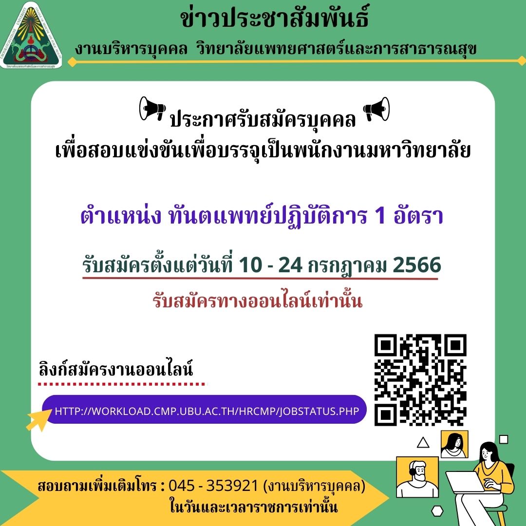 เรื่อง รับสมัครสอบแข่งขันบุคคลเพื่อบรรจุแต่งตั้งเป็นพนักงานมหาวิทยาลัย ตำแหน่ง ทันตแพทย์ปฏิบัติการ จำนวน 1 อัตรา สังกัดโรงพยาบาลมหาวิทยาลัยอุบลราชธานี