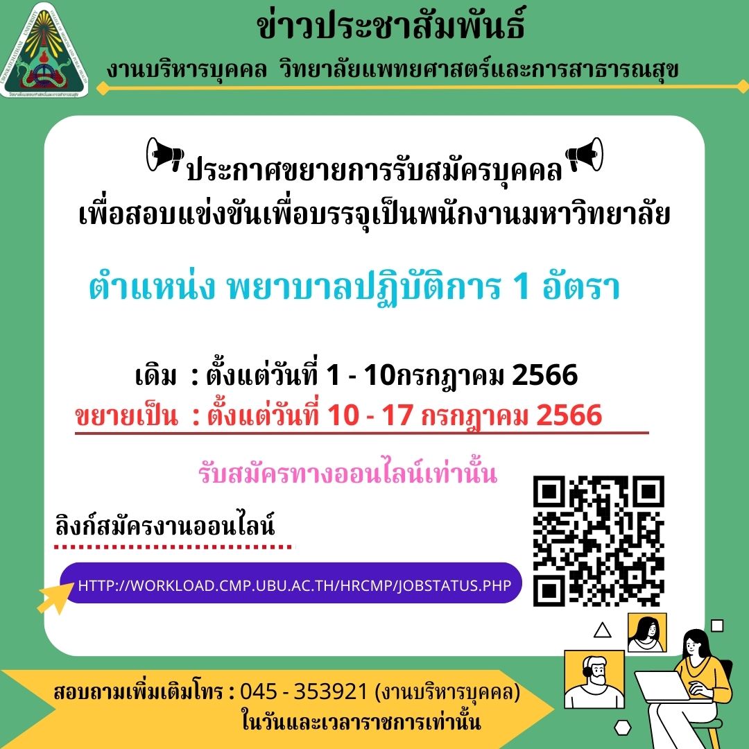 เรื่อง ขยายการรับสมัครสอบแข่งขันบุคคลเพื่อบรรจุแต่งตั้งเป็นพนักงานมหาวิทยาลัย ตำแหน่ง พยาบาลปฏิบัติการ จำนวน 1 อัตรา สังกัดโรงพยาบาลมหาวิทยาลัยอุบลราชธานี