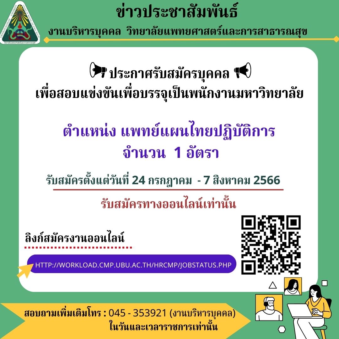 เรื่อง รับสมัครสอบแข่งขันบุคคลเพื่อบรรจุแต่งตั้งเป็นพนักงานมหาวิทยาลัย ตำแหน่ง แพทย์แผนไทยปฏิบัติการ จำนวน 1 อัตรา สังกัดโรงพยาบาลมหาวิทยาลัยอุบลราชธานี