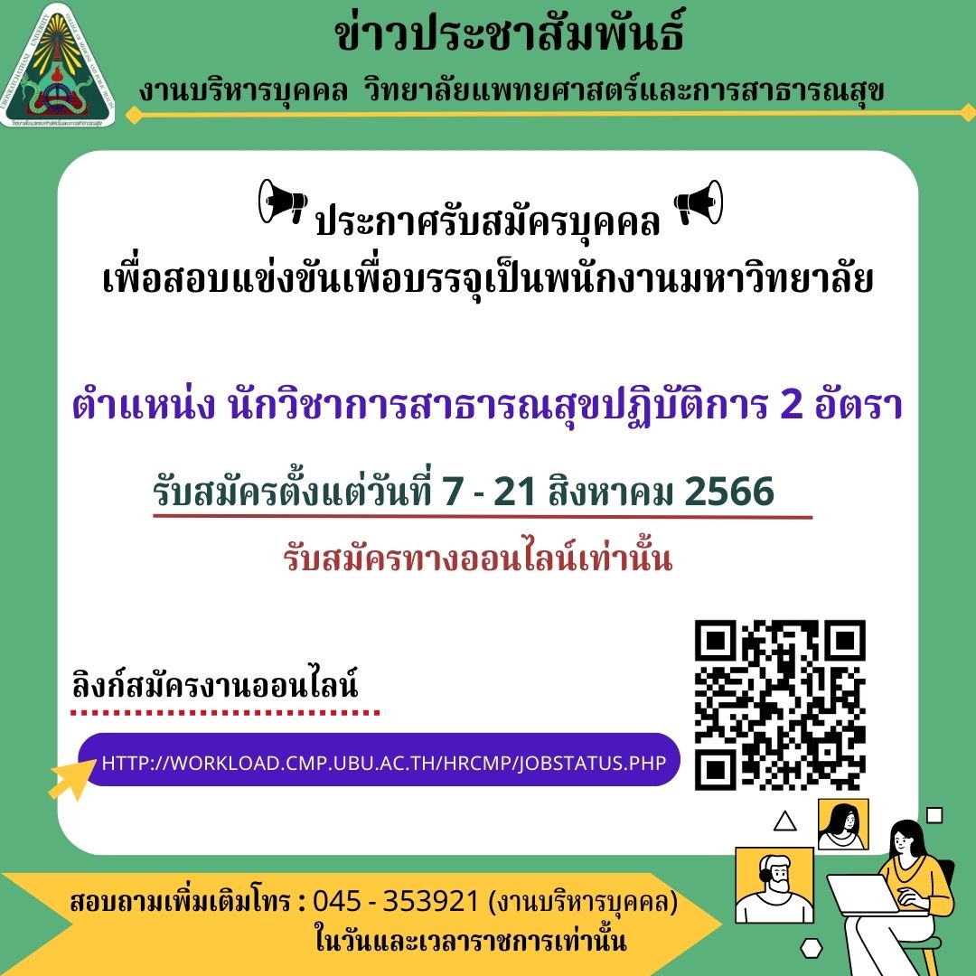 เรื่อง รับสมัครสอบแข่งขันบุคคลเพื่อบรรจุแต่งตั้งเป็นพนักงานมหาวิทยาลัย ตำแหน่ง นักวิชาการสาธารณสุขปฏิบัติการ จำนวน 2 อัตรา สังกัดโรงพยาบาลมหาวิทยาลัยอุบลราชธานี