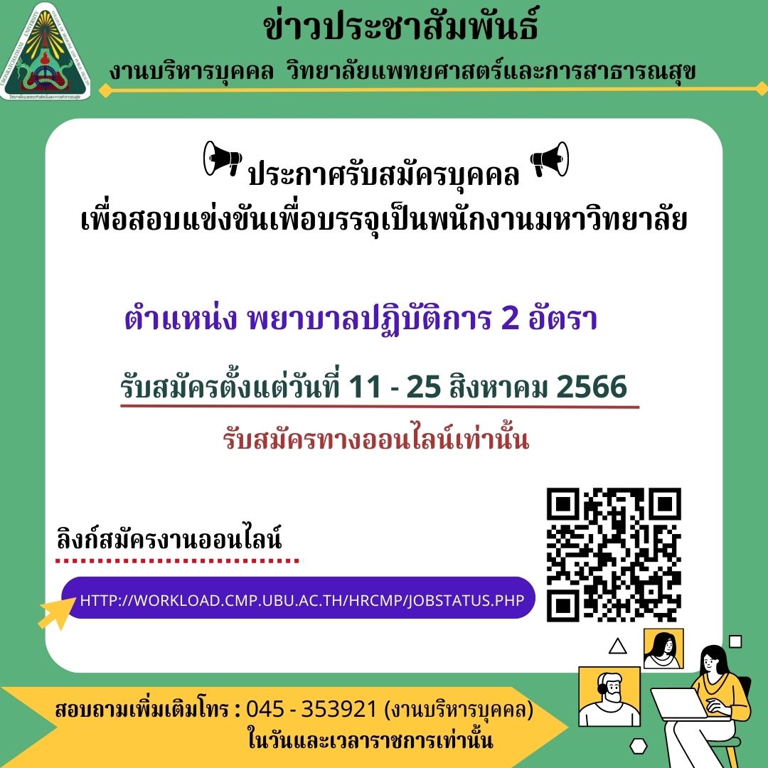 เรื่อง รับสมัครสอบแข่งขันบุคคลเพื่อบรรจุแต่งตั้งเป็นพนักงานมหาวิทยาลัย ตำแหน่ง พยาบาลปฏิบัติการ จำนวน 2 อัตรา สังกัดโรงพยาบาลมหาวิทยาลัยอุบลราชธานี
